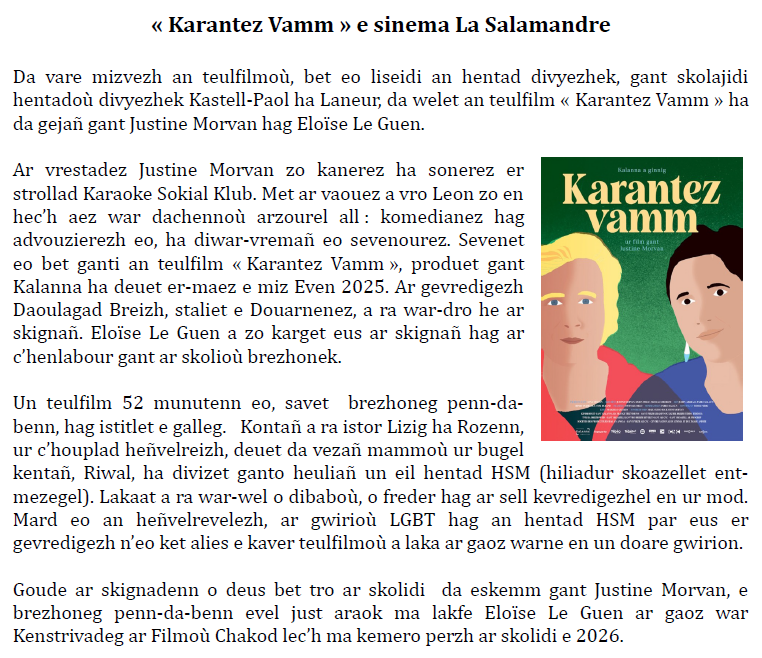 Projection du film « Karantez Vamm » et rencontre avec Justine Morvan et Eloïse Le Guen (article en breton et en français)